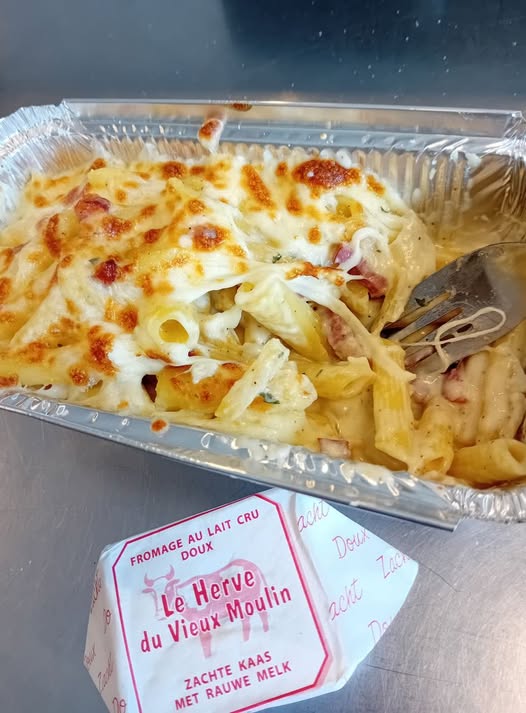 LA HERVIENNE: lardons fumés, oignons, crémé , parmesan, herve doux du vieux moulin, vin blanc, épices et gratinée avec amour. 16€